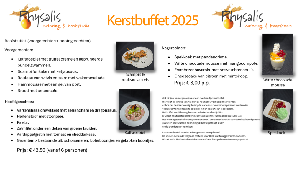Catering op maat in ReuselOntdek ons feestelijke kerstmenu, zorgvuldig samengesteld voor een zorgeloze kerst. Bestel eenvoudig online en laat het bij je thuis bezorgen. Bestel hier Neem contact met ons opOntdek meer